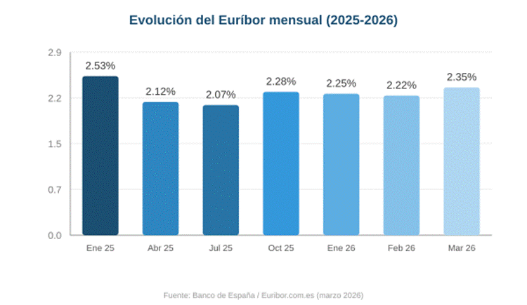 Como se aprecia en el gráfico, tras las bajadas sostenidas del primer semestre de 2025 (cuando el Euríbor llegó a tocar el 2,07% en julio), el índice ha entrado en una fase de estabilización con fluctuaciones acotadas. El repunte de marzo de 2026, sin embargo, rompe esa meseta y añade incertidumbre al escenario que los analistas habían considerado más probable.