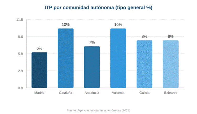 Las diferencias son significativas: para una vivienda de 200.000 euros, pagarías 12.000 euros de ITP en Madrid (6%) pero 20.000 en Cataluña o Valencia (10%). Eso son 8.000 euros de diferencia solo por la ubicación. Si eres joven menor de 35 años, consulta siempre el tipo reducido de tu comunidad, porque en algunos casos (como Galicia con el 3%) el ahorro puede superar los 10.000 euros.
